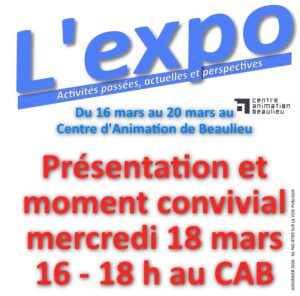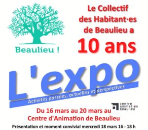 A l’occasion des 10 ans de l’association Collectif des habitant·es de Beaulieu, venez découvrir une rétrospective des différentes actions dans le hall du Centre d’Animation de Beaulieu du 16 au 20 mars 2026. Cette exposition montre l’activité du Collectif et de ses partenaires durant les 10 années passées, depuis la création du Collectif des Habitant·es de Beaulieu, jusqu’à aujourd’hui, en textes et photos. Cette exposition est accessible aux heures d’ouverture du Centre d’Animation et précisément : lundi 16 mars de 14h à 18h du mardi 17 mars au vendredi 20 mars de 9h à 12h30 et de 14h à 18h.…
